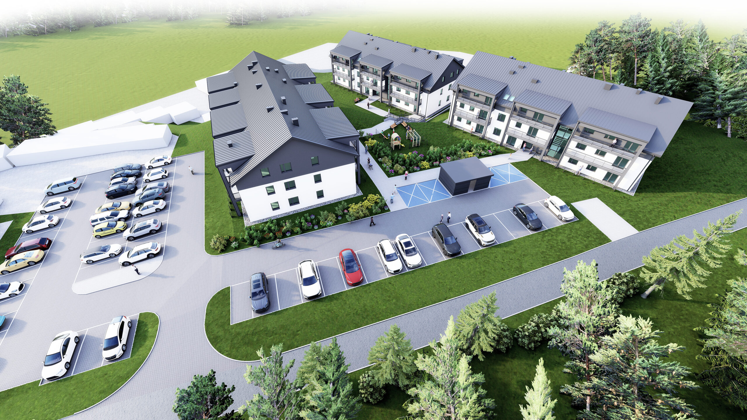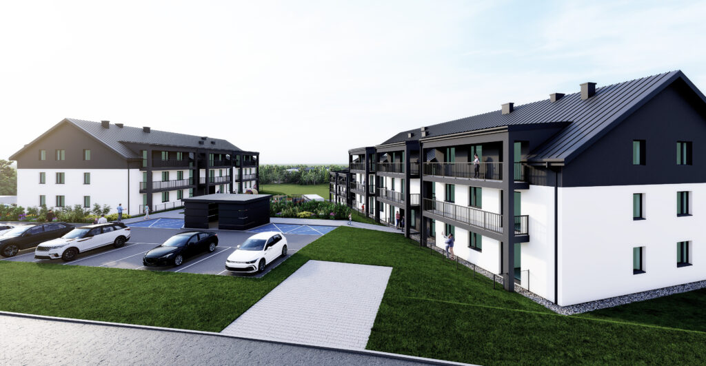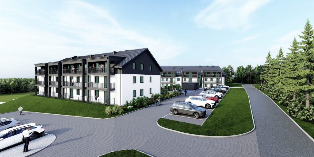 - Budowę dwóch budynków mieszkalnych wielorodzinnych składających się łącznie z 62 mieszkań o zakładanej średniej powierzchni 52 m2.