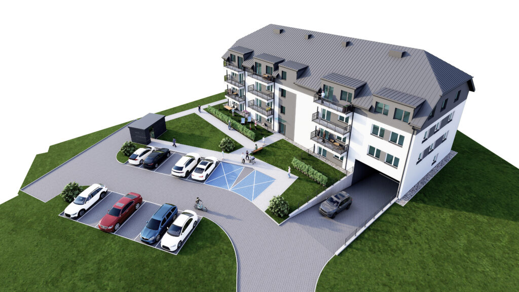 - Budowę jednego budynku mieszkalnego wielorodzinnego trzyklatkowego (4 kondygnacje nadziemne i jedna podziemna) składającego się łącznie z 28 mieszkań o zakładanej łącznej powierzchni użytkowej mieszkań 1297,01 m2 wraz z garażem podziemnym na 12 miejsc oraz 16 miejscami postojowymi naziemnymi.
